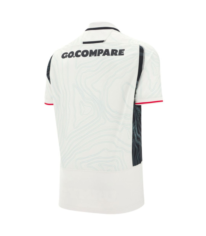 Maillot réplica extérieur Rugby du Pays de Galles - maillot ample crème avec carte topographique bleue de Yr Wyddfa sur le corps et les manches , panneaux noirs sur les côtés et détails noirs et rouges sur le col et les poignets.