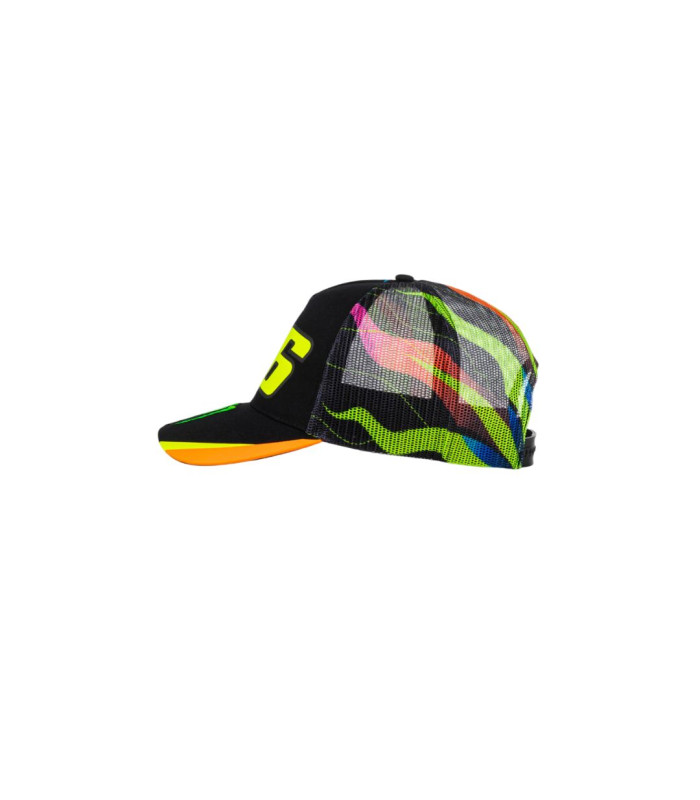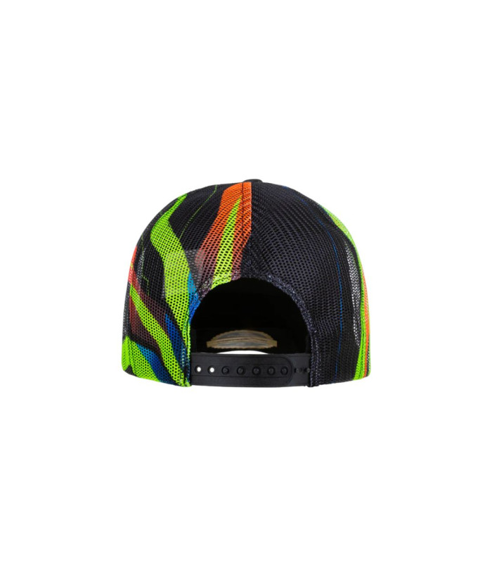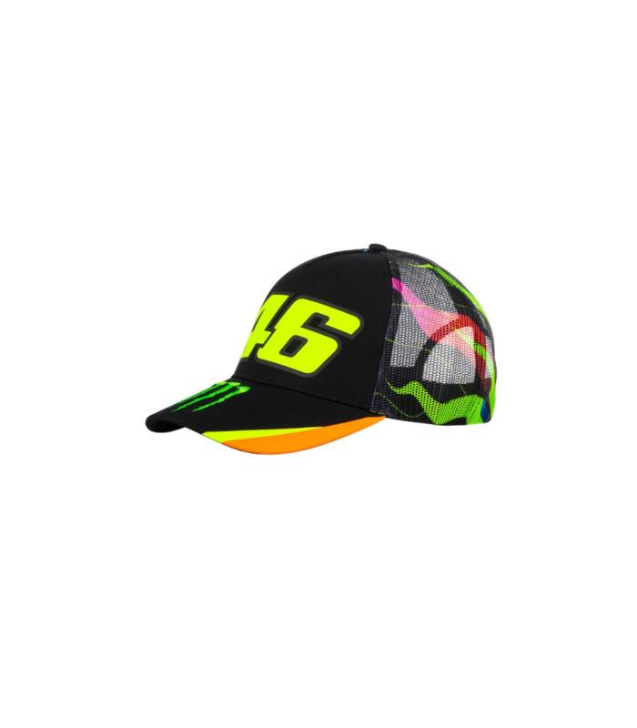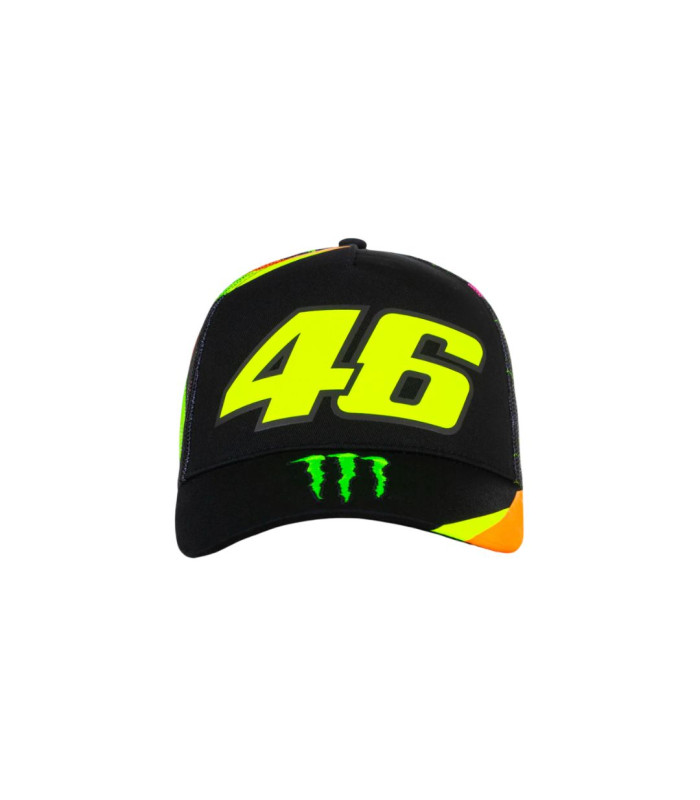 Casquette trucker en coton et polyester appartenant à la collection Monster VR46. Imprimé du numéro 46 sur le devant, broderie de la griffe Monster Energy sur la visière. À l'arrière, une maille respirante douce avec l'imprimé soleil-lune présent sur le casque de Valentino Rossi. Taille unique réglable à l'arrière.
