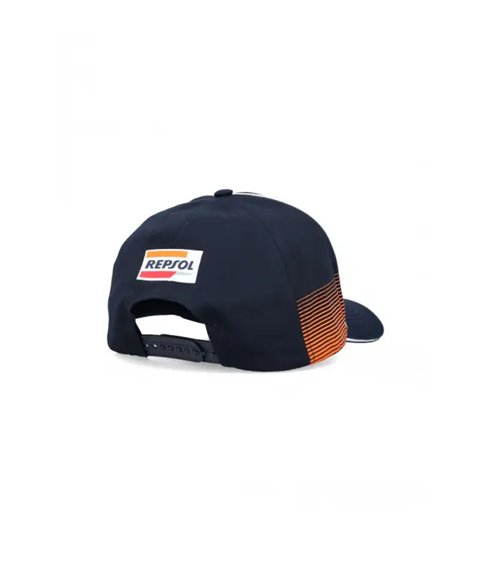 Casquette de baseball de la collection officielle Repsol Racing. Base bleue avec détails rayés orange et rouge sur les côtés; logo "Repsol sun" sur le devant. Composition: 100 % coton
