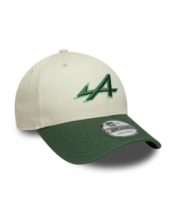 Casquette 9FORTY Adjustable Alpine Racing Blanc, logo Alpine Racing sur le devant, New Era Flag brodé à gauche, Couronne structurée, Sangle réglable, Visière courbée vert foncé, Sous-visière vert foncé, 100 % COTON