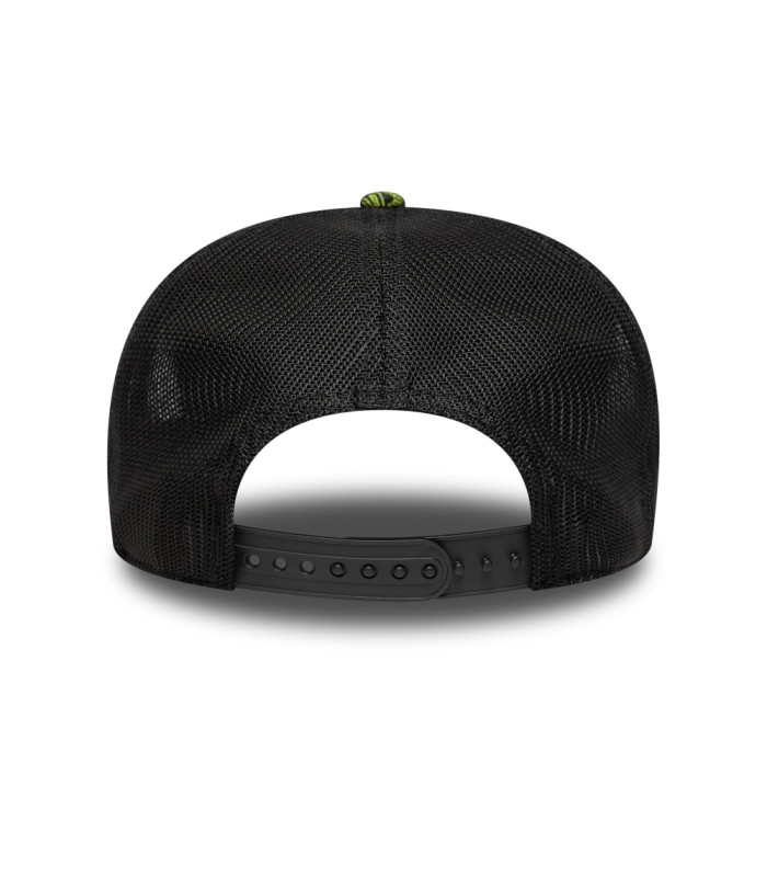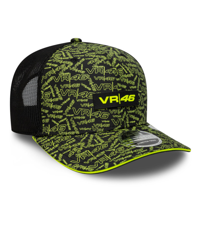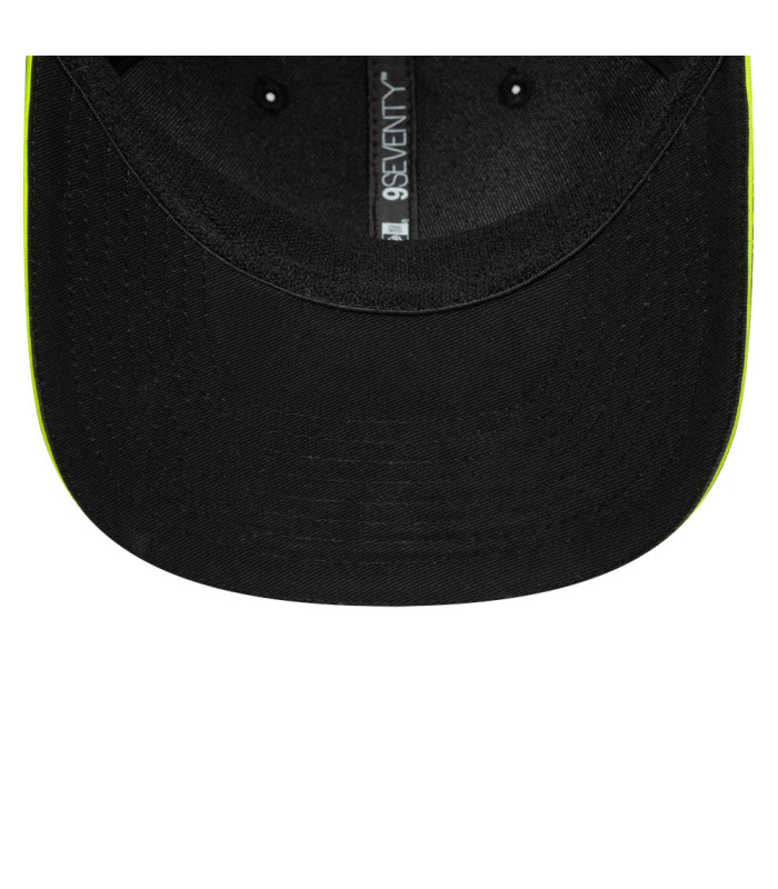Casquette 9SEVENTY Stretch Snap VR46 All Over Print Noir, Logo VR47 Box sur le devant, logo VR47 imprimé sur l’ensemble de la couronne et de la visière, New Era Flag brodé à gauche, Couronne structurée, Stretch Snap, Visière sandwich courbée avec intérieur jaune fluorescent, Sous-visière noire, Mesh sur les côtés et à l’arrière, 94 % POLYESTER, 6 % SPANDEX