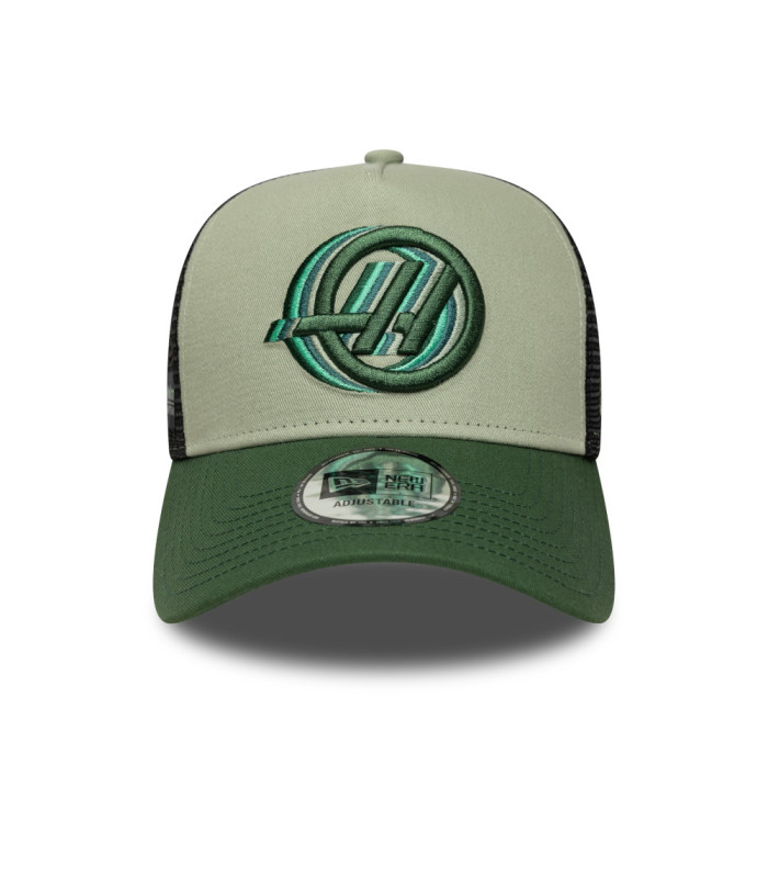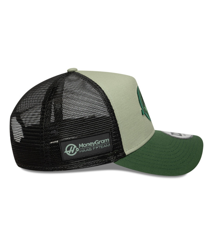 Casquette 9FORTY A-Frame Trucker MoneyGram Haas F1 Vert foncé, Logo MoneyGram Hass F1 sur le devant, Patch MoneyGram Haas Formula 1 à droite, New Era Flag brodé à gauche, Couronne structurée A-Frame, Snapback, Visière courbée vert foncé, Sous-visière vert foncé, Mesh sur les côtés et à l’arrière, 50 % coton, 50 % polyester