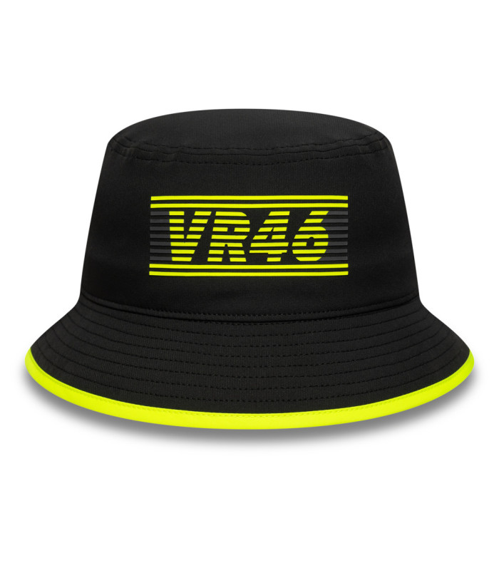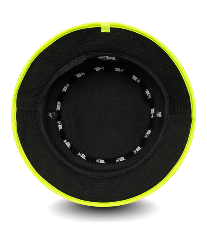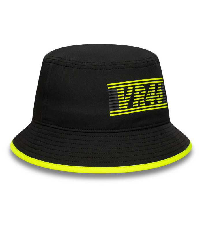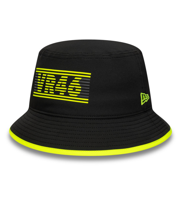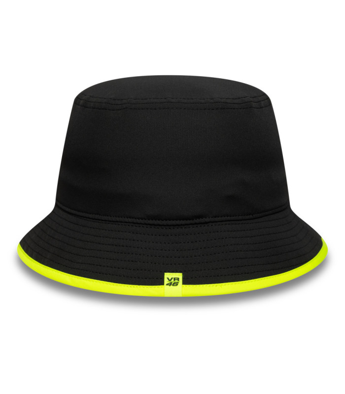 Bob VR46 Recycled Noir, Logo VR46 avec rayures sur le devant, Étiquette tissé VR46 à l’arrière, New Era Flag brodé à gauche, Visière tout autour avec bordure jaune fluorescent, Sous-visière noire, Couronne non-structurée, Fabriqué à partir de matière recyclée, 90 %, POLYESTER RECYCLÉ, 10 % ÉLASTHANNE
