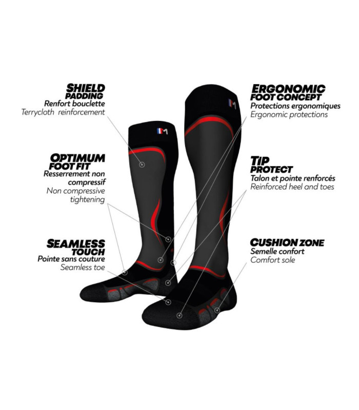 LA FRENCH, SYMBOLE DU SAVOIR-FAIRE 100% MADE IN FRANCE DE MONNET. Chaussettes Ski French Monnet doté d'une large protection malléolaire en bouclette molleton.