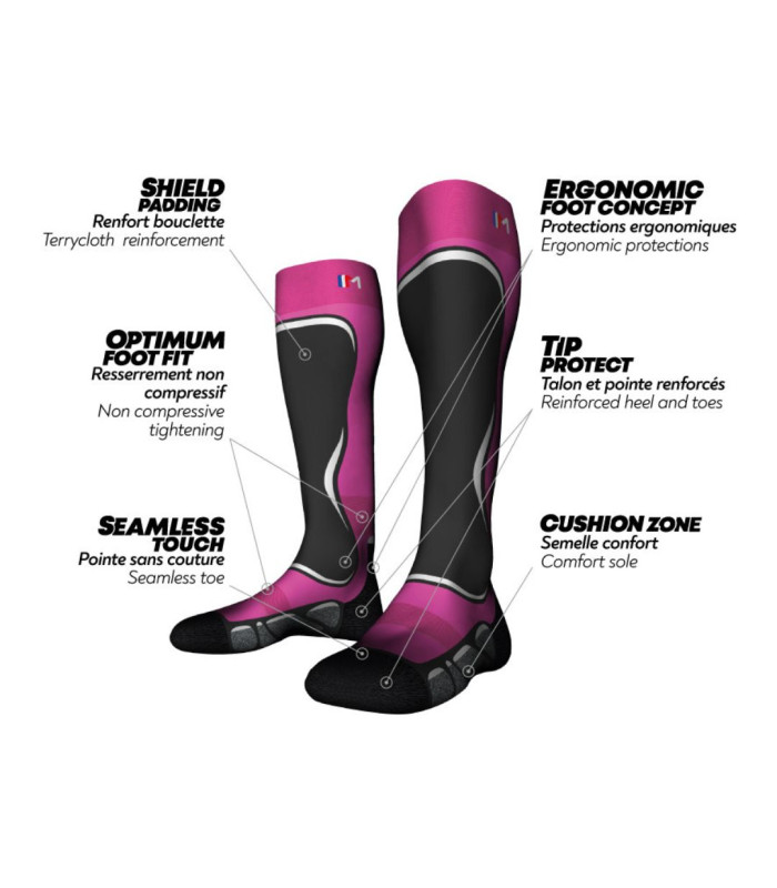 LA FRENCH, SYMBOLE DU SAVOIR-FAIRE 100% MADE IN FRANCE DE MONNET. Chaussettes Ski French Monnet doté d'une large protection malléolaire en bouclette molleton.