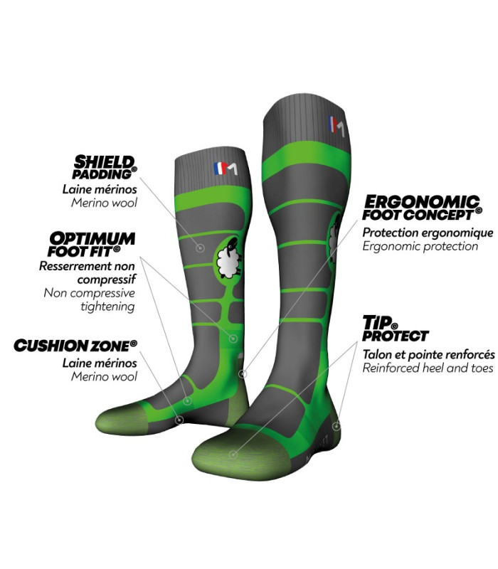 LA FRENCH, SYMBOLE DU SAVOIR-FAIRE 100% MADE IN FRANCE DE MONNET. Chaussettes Ski French Monnet doté d'une large protection malléolaire en bouclette molleton.