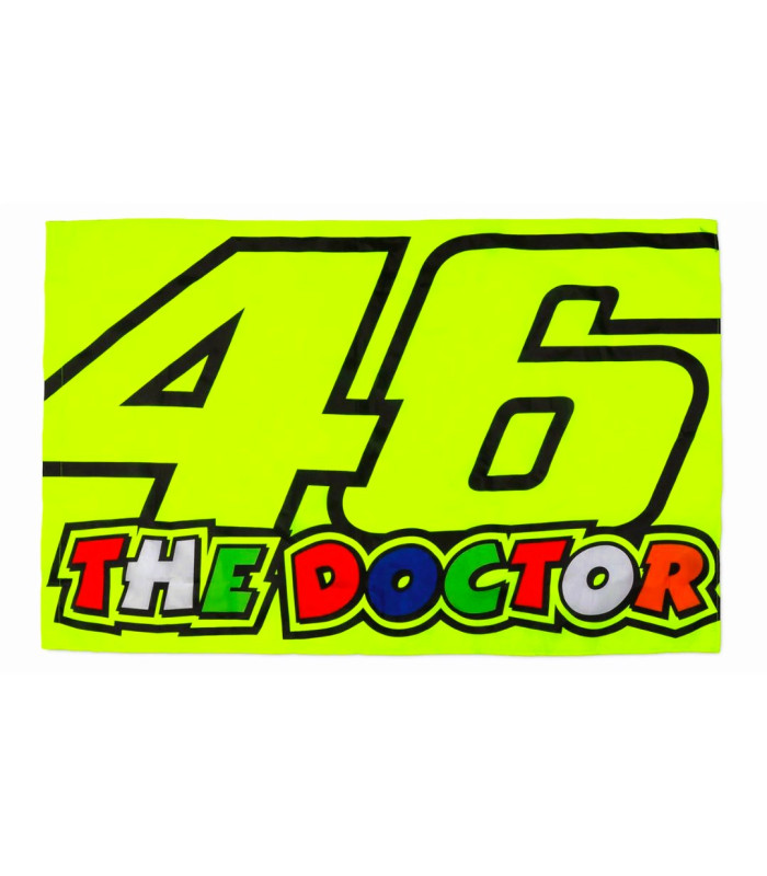 Drapeau en polyester appartenant à la collection VR46 Heritage et représentant le numéro 46 et la marque The Doctor. Dimensions : 140 x 90 cm. 100%POLYESTER