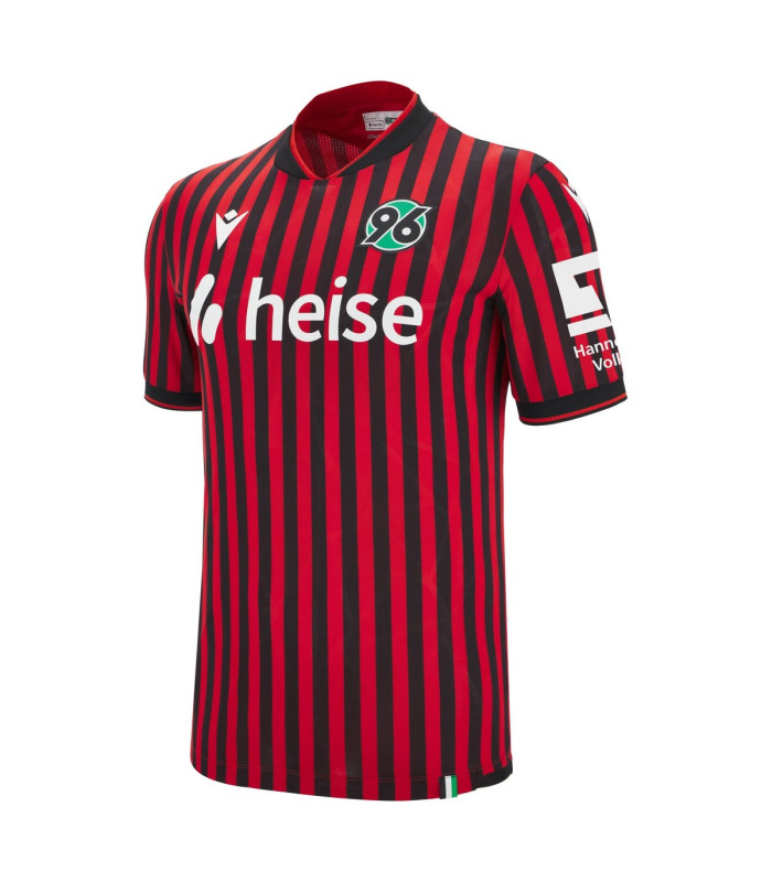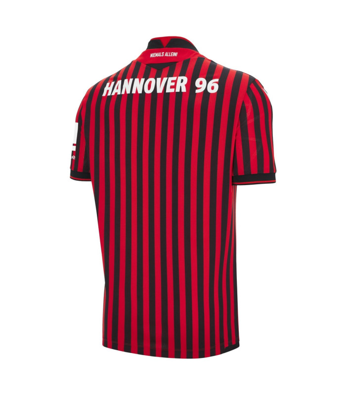Le maillot de match domicile Hannover 96 présente une base rouge traversée de fines rayures verticales noires, un classique du club revisité dans un style contemporain. Le col coréen et les bords de manches noirs apportent cohérence et définition au design. L'inscription 'NIEMALS ALLEIN' figure à l'arrière du col, symbole du lien fort entre l'équipe et les supporters, tandis que le bas du maillot révèle à l'intérieur le message 'LOVE HANNOVER HATE RACISM', en faveur de l'inclusion. Le maillot est confectionné en EcoKnit Effect avec des inserts en Eco Micromesh, alliant performance et confort tout au long du match.