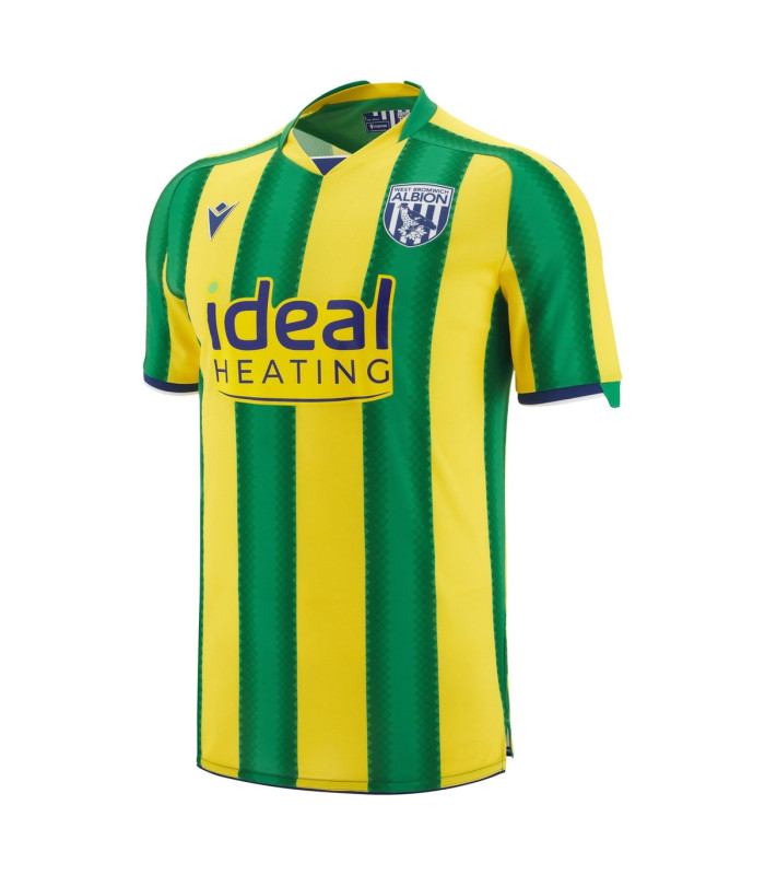 Le maillot extérieur West Bromwich Albion se distingue par l'alternance dynamique de bandes verticales vertes et jaunes, enrichies d'un motif géométrique ton sur ton qui apporte du mouvement au design. Le col en V et les poignets affichent des détails bleu marine et blancs, en harmonie avec les couleurs traditionnelles du club. Sur la poitrine figurent le blason de l'équipe et le Macron Hero en silicone, tandis que l'ourlet intérieur présente le message 'The moment I walked into The Hawthorns I felt I was home', un hommage au lien avec le stade et les supporters. Le vêtement est fabriqué en Eco Piola avec des inserts en Eco Micromesh et Eco Softlock pour garantir respirabilité et confort optimal.