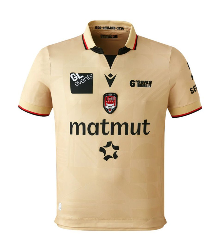 Maillot third officiel LOU Rugby signé Macron. Son coloris or éclatant célèbre les 100 ans du Matmut Stadium et rend hommage à l'audace du club lyonnais avec un design moderne et symbolique. Écusson LOU et sponsors officiels apposés sur la poitrine pour un rendu identique à celui porté par les joueurs. Conçu dans un tissu technique respirant à séchage rapide, il assure confort et performance à l'entraînement comme les jours de match. Finitions travaillées au col et aux manches.