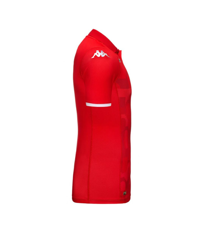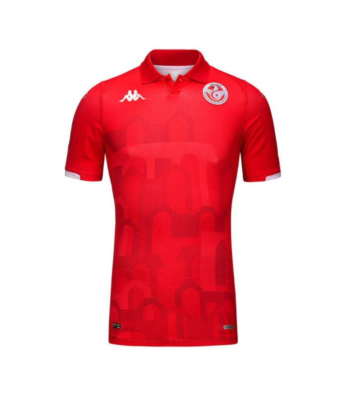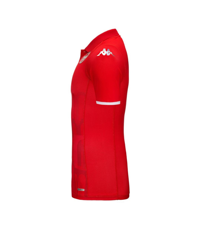 Pour cette édition de la CAN, Kappa et la FTF s'associent une nouvelle fois et offrent une nouvelle gamme professionnelle de qualité pour tous les fans de la sélection tunisienne. Le maillot HOME est inspiré de EL JEM, un symbole important de la ville de EL DJEM en Tunisie qui est également enregistré au patrimoine de l'UNESCO depuis 1979. Enfin, les logos sont conçus en matière dichroïque ce qui montre l'innovation et l'envie de la marque à confectionner des maillots de qualités à la sélection tunisienne. Technologie Kombat Pro : matière technique utilisant la technologie Hydro-Way Protection qui permet l'évacuation de la transpiration pour vous garder au sec dans toutes les circonstances. 85% polyester, 15% élasthanne. Lavage en machine à 30°. Rouge, blanc. Coupe très ajustée.