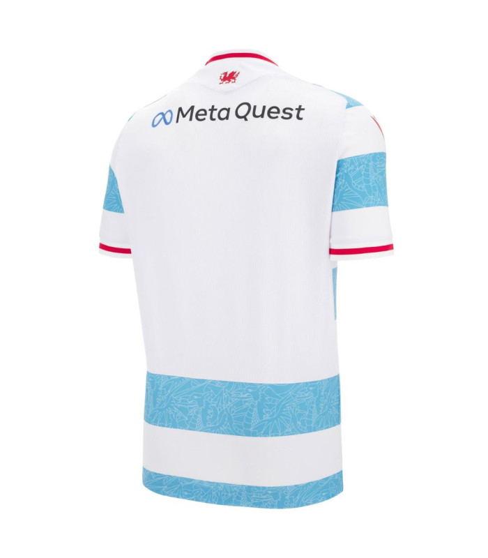 Le troisième maillot du Wrexham AFC pour la saison arbore un design audacieux avec des rayures horizontales blanches et bleu ciel, rehaussées d'un motif sublimé représentant l'emblématique dragon gallois. Le maillot est doté d'un col rond côtelé avec un liseré rouge, un détail que l'on retrouve également sur les bords des manches. La phrase « N'oublie pas d'où tu viens » est imprimée sur la bande de propreté intérieure, un message fort d'appartenance. Ce maillot est confectionné en Eco Softlock et Eco Micromesh, des matériaux éco-responsables qui garantissent fraîcheur, respirabilité et un confort optimal.