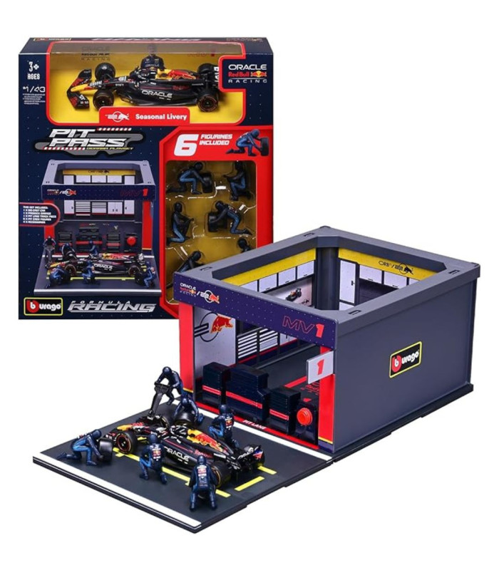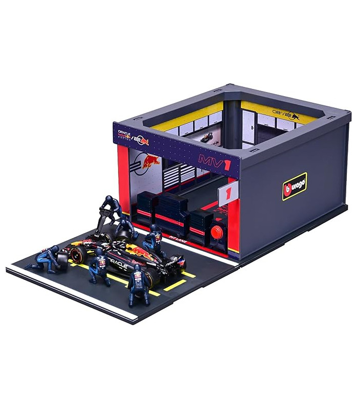 Bburago - Pit Stop Red Bull RB20 #1 Verstappen, Coffret avec Diorama, Véhicule 1:43 et 6 Mécaniciens, Réplique Détaillée, Licence Red Bull, Âge 3+ Ans