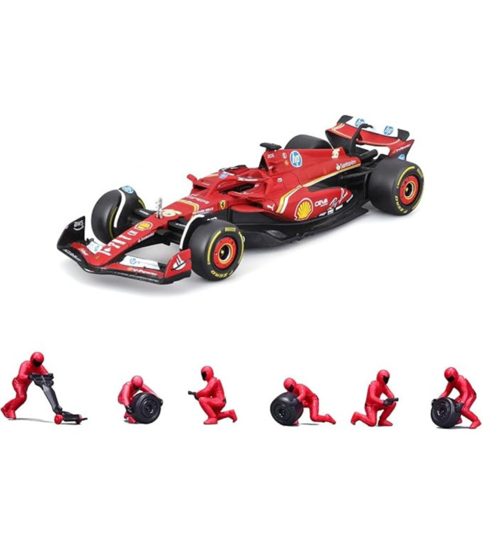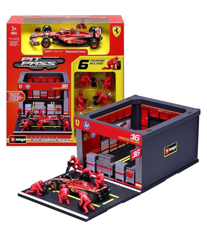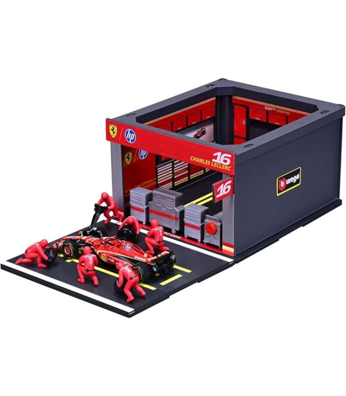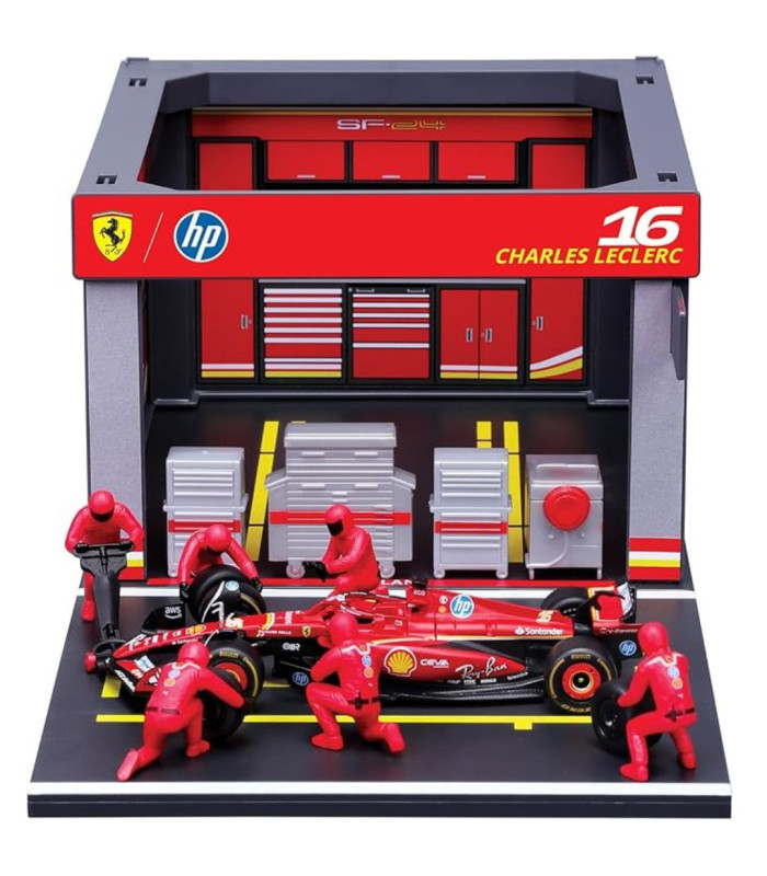 Pit Stop Ferrari SF-24 Leclerc 16, Playset avec Diorama, Véhicule 1:43 et 6 Mécaniciens