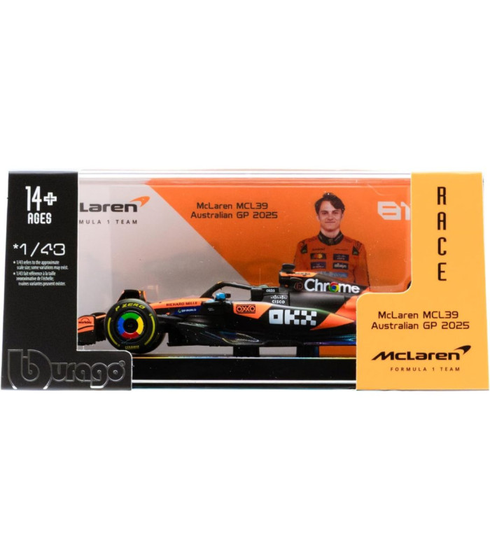 | Bburago - McLaren F1 MCL39 n°4 Norris, Voiture diecast échelle 1:43, réplique F1 McLaren, livrée Papaye/Noire |