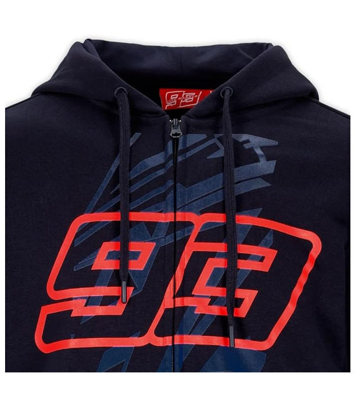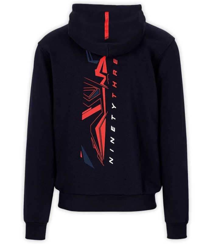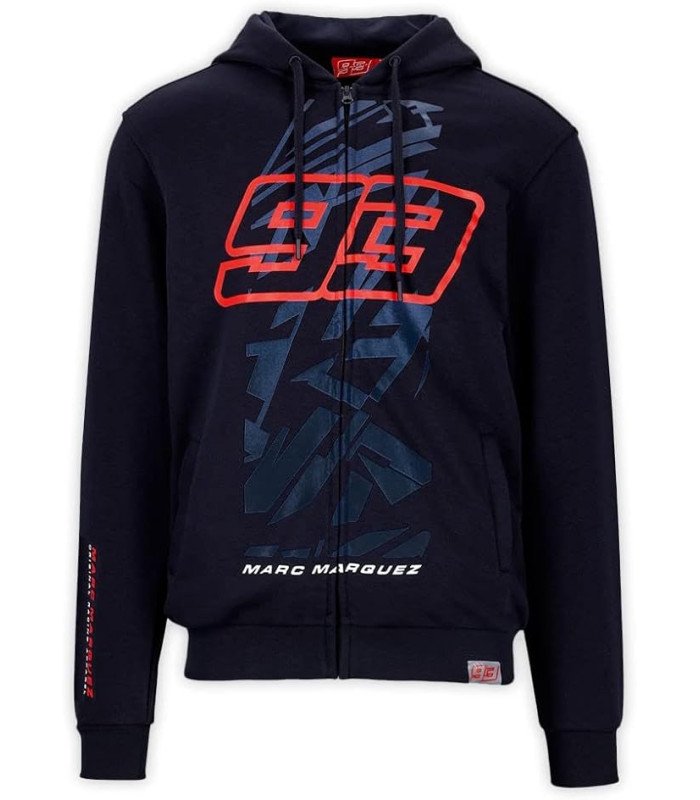 Sweat a Capuche Femme Marc Marquez Ninetythree MM93 Officiel MotoGP Sweat à capuche zippé pour femme de la collection officielle du pilote Marc Marquez. Base bleue avec imprimé Ninetythree rouge sur le devant, imprimé Marc Marquez sur le devant, la capuche et la manche droite. Capuche avec cordon de serrage, manches longues et poche kangourou. Composition: 80% coton 20% polyester