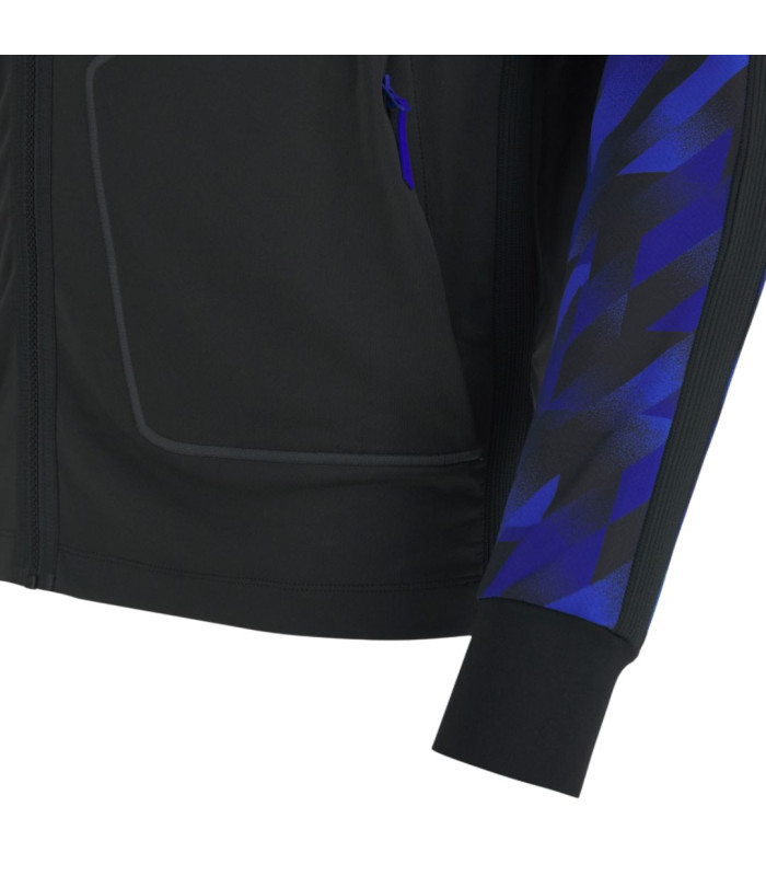 Caractérisée par des graphismes sublimés sur les manches dans des tons bleus et un design frontal épuré rehaussé de détails contrastés, elle présente une fermeture zippée intégrale pratique et des poches frontales fonctionnelles. La structure en tissu jacquard garantit confort et ajustement, tandis que les inserts valorisent la ligne du vêtement. Le logo Monster Energy Yamaha Moto GP est appliqué sur le côté gauche de la poitrine. Elle est également sublimée par les couleurs et les sponsors officiels de l'Équipe.