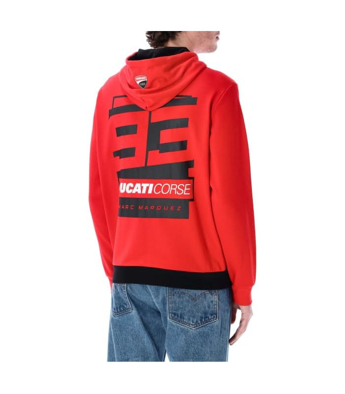Sweat à capuche zippé pour homme de la collection officielle du pilote Marc Marquez Dual Ducati. Base de couleur rouge avec logo du pilote imprimé. Composition : 100% Coton