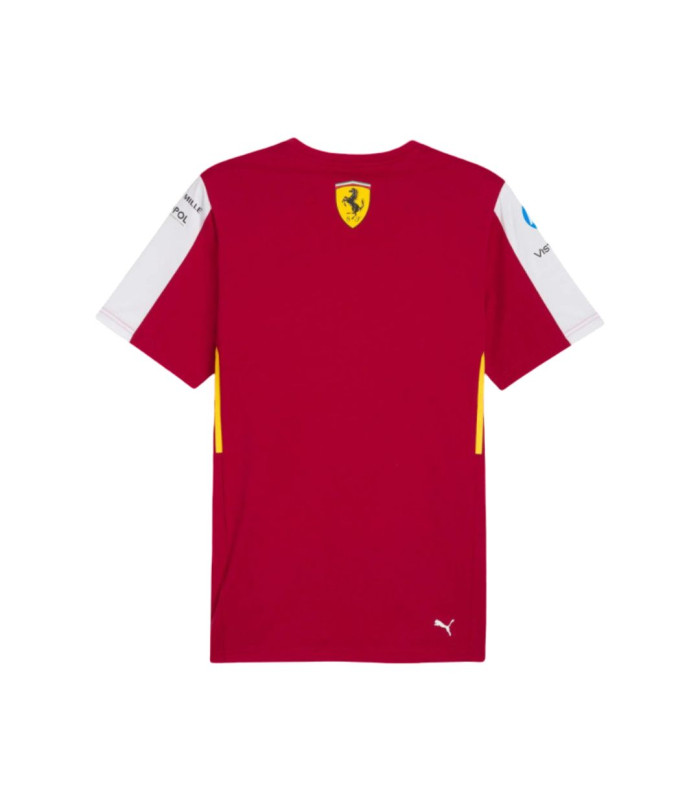 T-shirt officiel Puma de l’équipe Ferrari LMH. Coloris rouge cerise avec manches blanches et empiècements jaunes sur les flancs. Logos Ferrari, Puma, AF Corse et sponsors imprimés. Léger et technique, idéal pour représenter la Scuderia au quotidien.