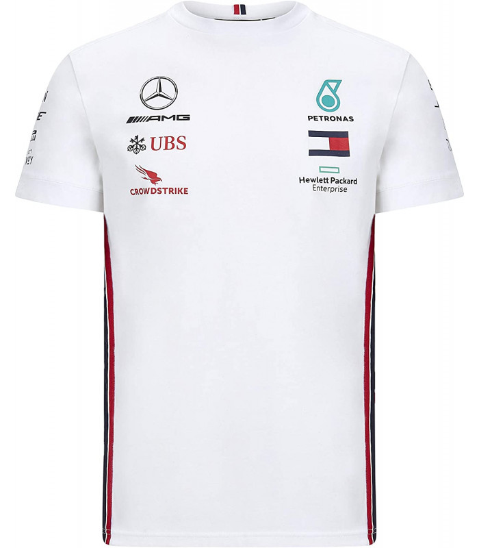 T-Shirt Enfant Mercedes-AMG Petronas Motorsport Team F1 Driver, Simple mais élégant, avec des détails argentés sur les épaules et des rubans colorés sur le cotés. Réplique officielle du tshirt du pilote portée lors de la saison de Formule 1.