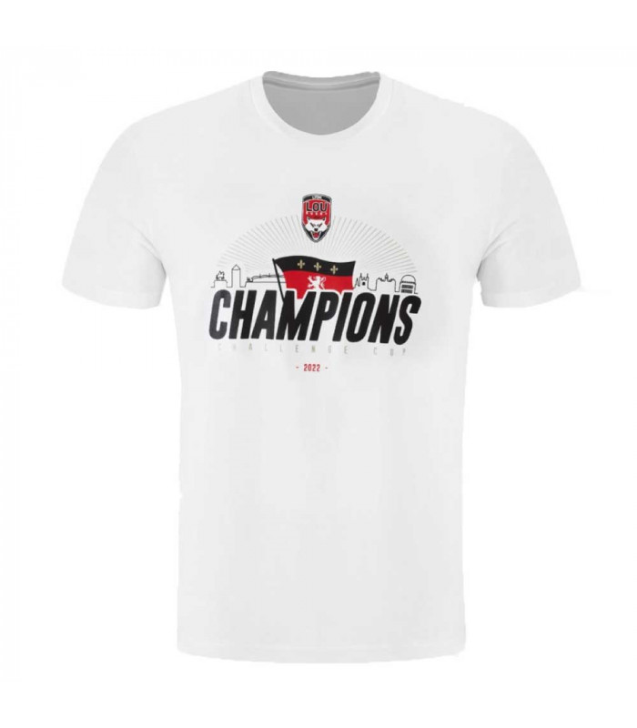 Tshirt Enfant LOU Rugby Champion Challenge Cup Officiel Lyon T-Shirt blanc célébrant la victoire du LOU Rugby en Challenge Cup. Idéal pour garder un souvenir de ce moment historique. Design « Champion Challenge Cup 2022 », surplombé d’une skyline des monuments lyonnais, du blason de la ville et de celui du club. L’ensemble des joueurs ayant contribué à cette victoire sont mentionnés à l’arrière du t-shirt. Tous les marquages sont des sérigraphies.