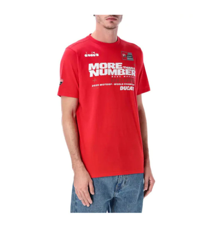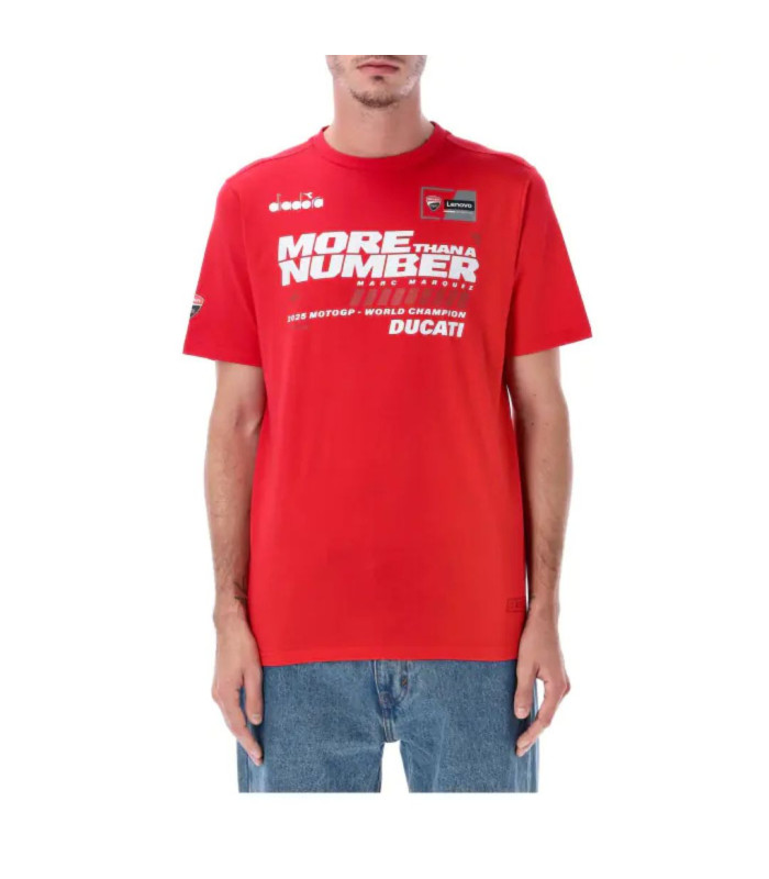 T-shirt commémoratif pour le Champion du Monde Moto GP , Marc Marquez.Collection capsule célébrant le partenariat gagnant entre Marc Marquez et Ducati, ainsi que l'importance du titre mondial  et le retour du pilote espagnol à la victoire après sa blessure.T-shirt à base rouge avec logos des sponsors imprimés sur le devant.Édition limitée.