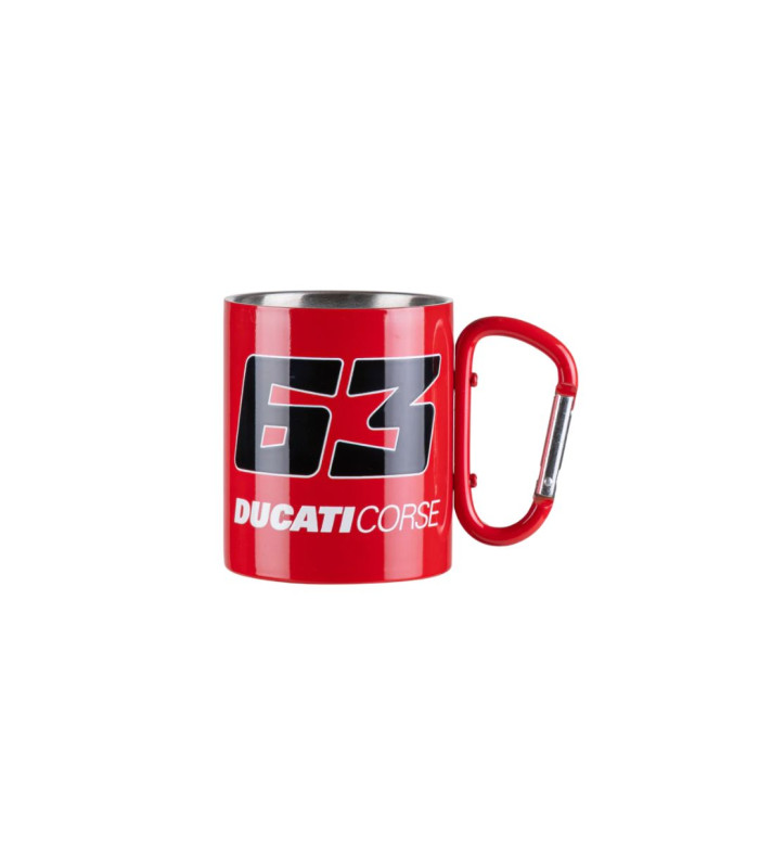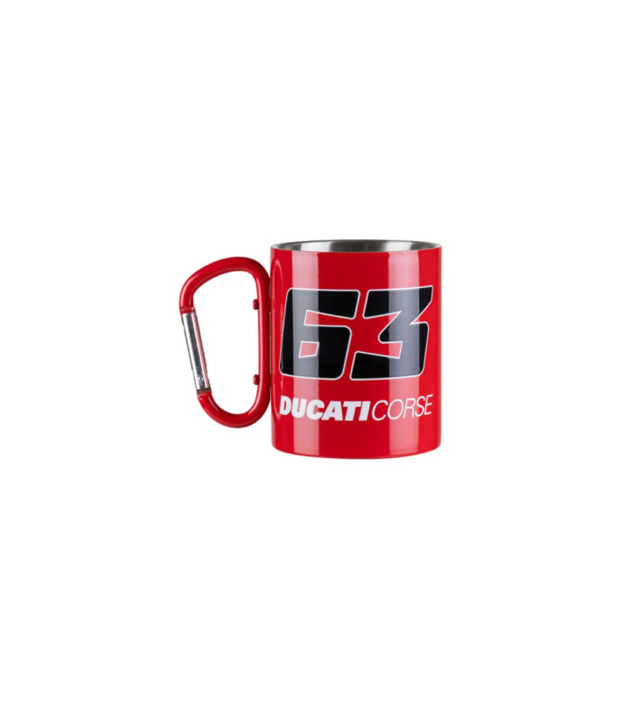 Tasse en métal appartenant à la collection Dual Ducati Corse de Francesco Bagnaia. Elle est dotée d'une anse mousqueton et arbore le numéro 63 et le logo Ducati Corse.